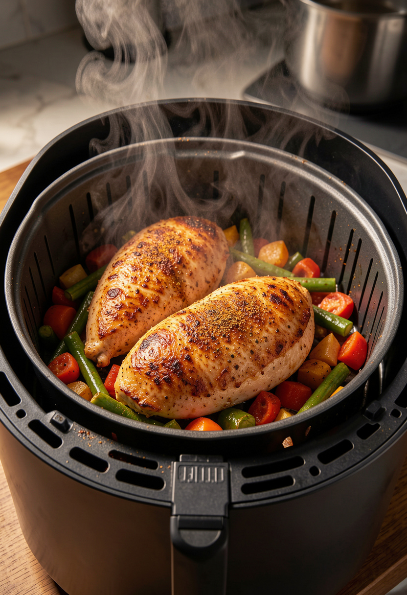 After the first stage of cooking add the seasoned vegetables into the basket beside the chicken if there is enough space. Continue cooking everything together for another 5–8 minutes until the chicken is fully cooked and the vegetables become tender with lightly roasted edges.